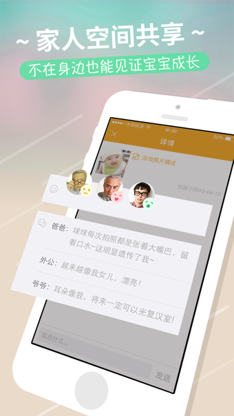 【家人共享】空间共享,受邀亲友可在新动态发布时即时获得通知,不在身边也能同步见证宝宝成长瞬间。