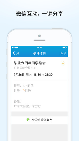 微日历与微信互通,支持将事件发送给微信好友,微信好友也可以一键将事件添加到微日历中,邀请好友或组织活动更方便