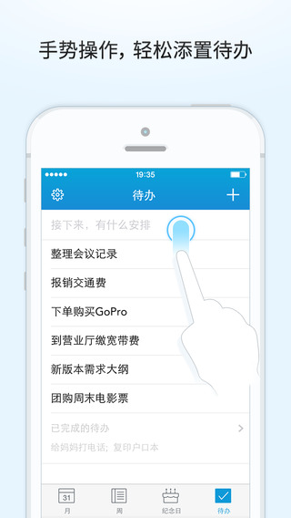 下拉新建,右滑标为完成,长按调整顺序,轻松快捷的手势操作