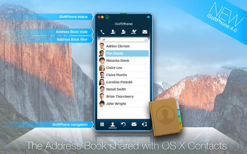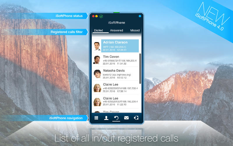 isoftphone Pro是一个OS X使用VoIP在漂亮光滑的界面提供清晰的语音质量先进的视频软电话。快速配置会让你很流畅的和其他用户进行聊天。isoftphone可以读取OS X的地址簿,打电话和联系人管理的功能,用户只需要说出联系人的名字,该软件就能自动进行搜索并且拨打电话。基于网络回拨技术的“免费电话”工具(APP)。这种通话的原理在于,首先是话务发起方(用户)拨打电话,通过回拨平台接入码(回拨平台服务器),平台接收到用户主叫号码后主动挂掉连接(实际上,中间不会出现挂断情况),在设定时间内以运营方的身份回拨到用户的话机上,用户接通后第一个通话链路建立(此时对任何方均无话费产生);随后,回拨平台收全被叫号后向被叫方发起第二次呼叫,如被叫方接通电话则第二条通话链路建立,同时回拨平台把两条链路搭通,主叫和被叫通话建立。