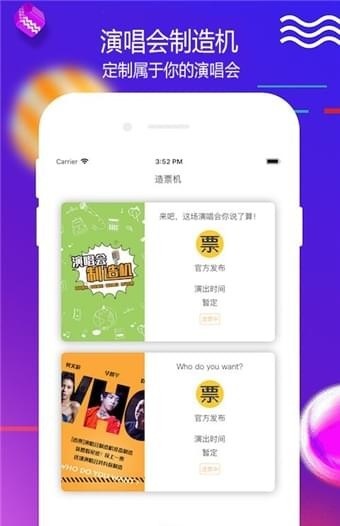 造票app,你造吗?造票app是一款致力于打造高品质,普惠价,参与性强的娱乐演出市场的移动在线购票APP,造票app为人们日益提升的移动品质文化生活需求而革新,匠心打造“互联网+娱乐演出”品牌,推崇你要的演出你来造!