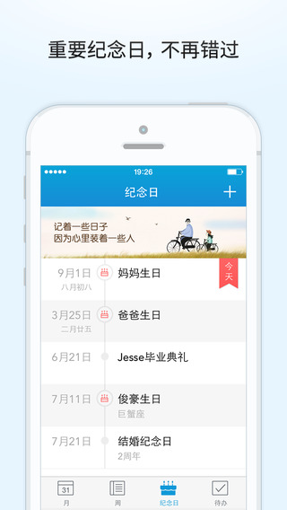 独立的纪念日视图,支持农历生日,毕业日、结婚纪念日、爱人生日一目了然