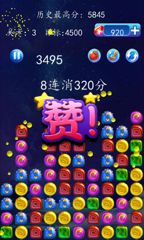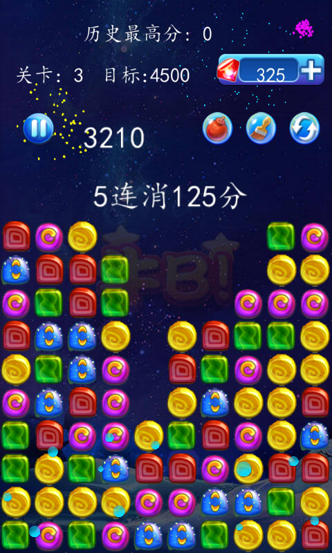 点击相同颜色的两个或更多的果浆块就可消除它们。 没有时间限制,但每个关卡都有一个目标得分,超过目标得分才能继续下一关。每一关结束的时候,都会有奖励分数。游戏,点击两个或多个相邻的果浆就可消除并获取积分,同时有着酷炫的游戏界面和效果!