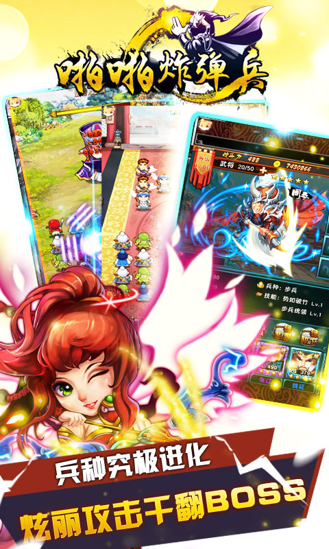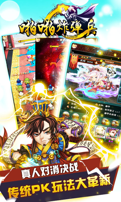 《啪啪炸弹兵》是一款以三国演义为背景的策略消除RPG手机网游,由知名发行商3K玩和寅酷游戏共同发行 。首创RPG玩家联网对战,真人对消,武将乱斗!让玩家体验极速爽快兵种消除、武将收集与养成、攻 打历史战役、群起诸侯攻乱世的无限乐趣。只等你来,决战天下!【游戏特点】
