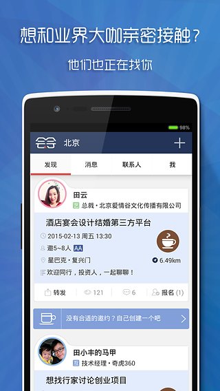 3.关系推荐主要依据地理位置、所处行业、手机通讯录几个维度,以帮用户找到更相关的人,同时促成更高效的会面。