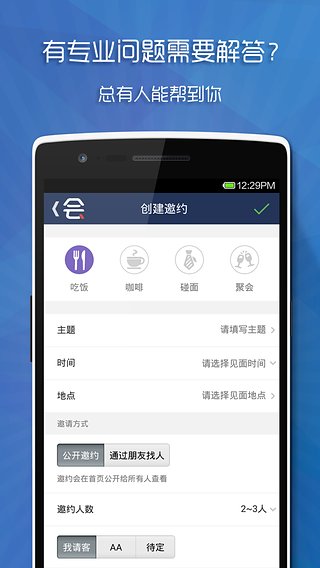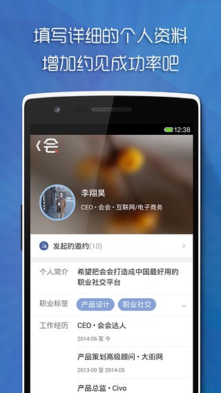 “会会”和Weave还不太一样。Weave是通过Linkedin上的职业档案来做速配。而“会会”则是一方主动发出主题邀请,感兴趣的人报名之后,“约主”再挑选合适的人来参加。目前,“会会”支持的会面人数上限为 50 人,这决定了它切的不是大规模行业活动。以后会会也会支持一些机构性质的小型沙龙等。基于小型活动,“会会”也会推出相应的建群机制,参加活动加微信群的场景大家应该很熟悉,“会会”则这种场景下的建群更自动化。该团队共有 10 人,大都来自百度、阿里、人人。其创始人李翔昊曾在优士网、经纬网、大街网供职,被问及做职场社交的教训,他说得很直接,就是“别照着 LinkedIn 抄“。“会会”已获得经纬数百万人民币天使融资,投资人正是投资陌陌的王华东。【软件特点】