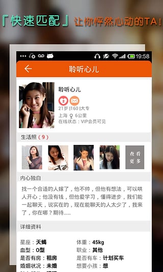 1、更快找到意中人:智能推荐同城异性,帮你发现近在身边的有缘人2、全面认识她:全方位生活照和个人资料,帮你轻松了解真实的她