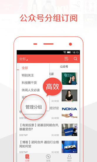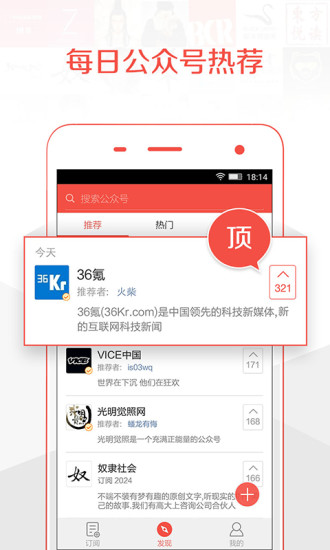 【订阅】:个性化订阅微信公众号,微信公众号文章同步更新,便捷好用;【发现】:发现优质公众号,享受最精品的阅读内容;