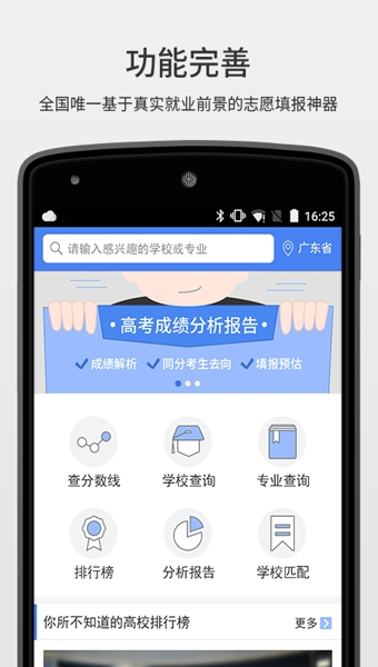 1、权威录取数据:来自考试院权威同步的3000万条考生录取数据, 覆盖全国2595所院校,1214个专业(包括本专科),精确到往年每一个考生的录取去向;2、独家就业报告:过往5年4000万高校毕业生最真实就业数据,学校就业“钱景”如何,大数据之下一目了然;