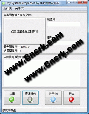 定制系统属性页的工具。 主要特点: · 选择您的商标 · 输入制造商信息 · 输入计算机型号 · 输入支持信息8行 · 全部应用