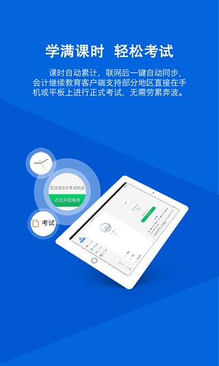 课时自动累计,联网后一键自动同步,会计继续教育客户端支持部分地区直接在手机或平板上进行正式考试,无需劳累奔波。