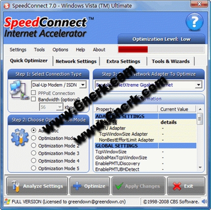 Speed Connect Internet Accelerator V7.5 英文绿色特别版 SpeedConnect Internet Accelerator可以帮助你利用自带的各种丰富的选项调整Windows的TCP/IP设定, 从而达到为下载文件及网络连线加速的目的,并支持各种不同的最佳化模式及网络连接工具。同时程序还附带了一个网络流量监测软件!