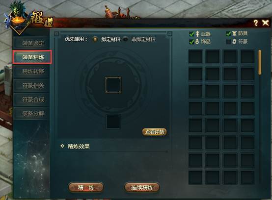 修真者如果对武器的资质不满意,可以对武器和装备进行洗资达到满意,也可以通过使用精炼神符对装备和武器进行升段提升,同时修真者也可以对装备和武器开孔进行符篆镶嵌。同时修真者也可以将符篆摘除或者精炼转移。