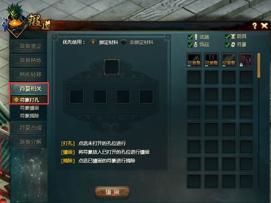 4.装备符篆只可镶嵌在已打开的孔位中,且同种属性的符篆在一件装备上只能镶嵌1枚