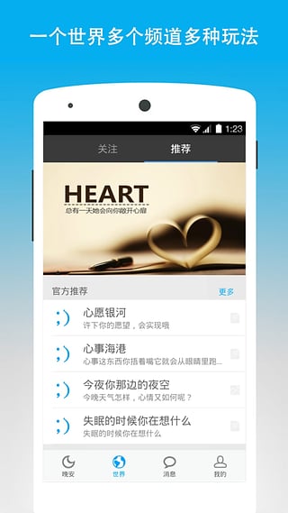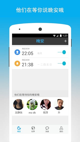 晚安、晚安世界、晚安地球人、晚安心语、晚安宝贝、晚安催眠曲、睡前故事、音乐故事和心事港湾、睡前活动、晚安电台、晚安日语、晚安语录、晚安短信、晚安英文、晚安图片、晚上去哪儿、邓紫棋晚安、林宥嘉晚安、goodn ight,一切尽在晚安世界,欢迎下载体验。相关应用:我要早睡、睡觉闹钟、健康闹钟、正点闹钟、最美闹钟、醒醒、谁叫我起床、谁叫你起床、时间表、晚安吻、微信、陌陌、蘑菇街、美美丽说、贴吧、same、gege、平行世界、社交闹钟