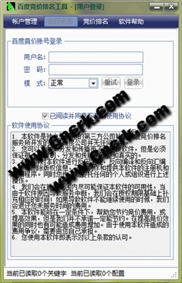 本软件是由郑州市未艾计算机有限公司开发,专门针对百度竞价排名的管理工具。使用此工具可以实现对百度竞价帐户的管理和控制,同时软件可以根据您设置的参数实现关键字自动出价、自动暂停等功能,以实现提高关键词排名、稳定关键词排名、降低关键词的价格、提高推广效果等功能。
