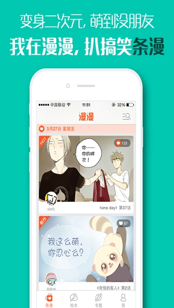 漫漫安卓版是一款在线看漫画的软件。漫漫安卓版每天提供超级无敌棒的漫画。带给你精彩。每天5分钟,喂饱你。保证原创。有意思的条漫,超级棒绘本。还有超级有新意的专题。喜欢的你就来吧!