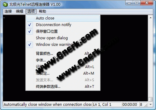 北极光Telnet远程连接器 V1.0 简体中文绿色免费版 有流行CRT Telnet客户机的所有特点,包括:自动注册、对不同主机保持不同的特性、颜色设置、可变屏幕尺寸、用户定义的键位图和优良的VT100和ANSI竞争。能从命令行中运行或从浏览器中运行。其它特点包括文本手稿、易于使用的工具条、用户的键位图编辑器、可定制的ANSI颜色等。是远程TELNET管理程序中不错的一款软件,最重要的是它是免费绿色软件.