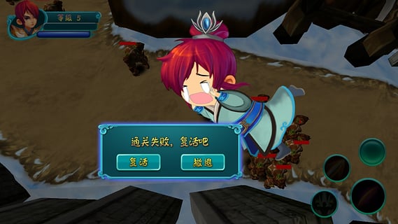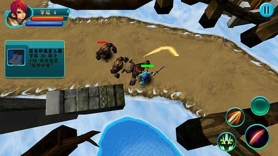 战斗场景--进入战斗,玩家手指点击地面移动角色到手指点击的目标位置,当遇到怪物时,点击右下角的技能按钮触发技能的释放,杀死怪兽。当新一波怪兽来袭时,游戏左侧界面会出现提示。