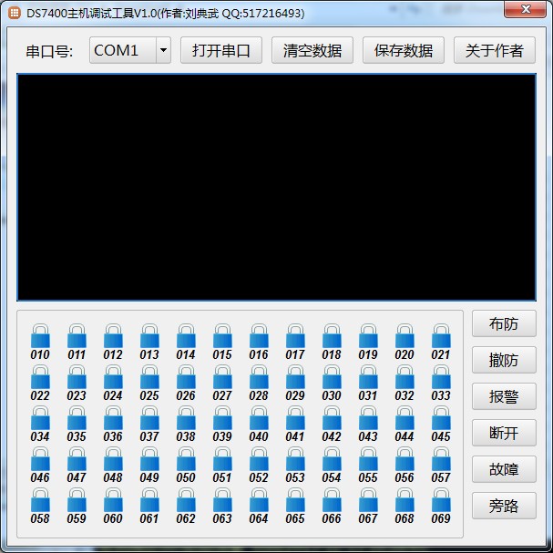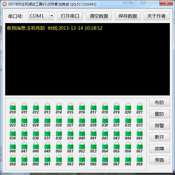 DS7400主机调试工具,可以用来与DS7400主机通信,DS7400调试工具能够识别主机布防撤防,防区报警,防区旁路,防区断开故障等情况。无需安装任何框架,绿色版。通过串口与DS7400报警主机通信,解析协议并作出处理.
