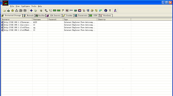 可以crack屏保、PWL密码、共享密码、缓存口令、远程共享口令、SMB口令、支持VNC口令解码、Cisco Type-7口令解码、Base64口令解码、sql server 7.0/2000口令解码、Remote Desktop口令解码、Access Database口令解码、Cisco PIX Firewall口令解码、Cisco MD5解码、NTLM Session Security口令解码、IKE Aggressive Mode Pre-Shared Keys口令解码、Dialup口令解码、远程桌面口令解码等综合工具,还可以远程crack,可以挂字典以及暴力crack,其sniffer功能极其强大,几乎可以明文捕获一切帐号口令,包括FTP、HTTP、IMAP、POP3、SMB、TELNET、VNC、TDS、SMTP、MSKERB5-PREAUTH、MSN、RADIUS-KEYS、RADIUS-USERS、ICQ、IKE Aggressive Mode Pre-Shared Keys authentications等。【软件功能】