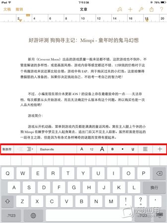 在编辑文档,弹出键盘的时候,我们看到新版本的键盘上多了一行工具栏,这里包括了最常用的文本格式,帮助你在输入的时候同时轻松的编辑格式,而旧版本中则没有这个功能。