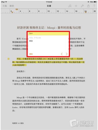 选择单词或段落之后,在新版本中,会看到一个批注的按钮,你可以对文章进行高亮批注或输入修改意见,当然这是其他应用中常用的功能,如今在 pages 中得以实现,还是非常喜闻乐见的。