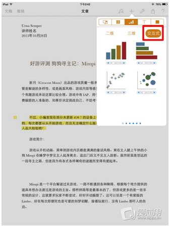 Pages编辑页中选择右上方的“+”可以插入图形图表,如下图所示,我们看到了新版本中增加了“交互式”这一功能(旧版本只有二维,三位),让你的文档在交互性上更进一步!