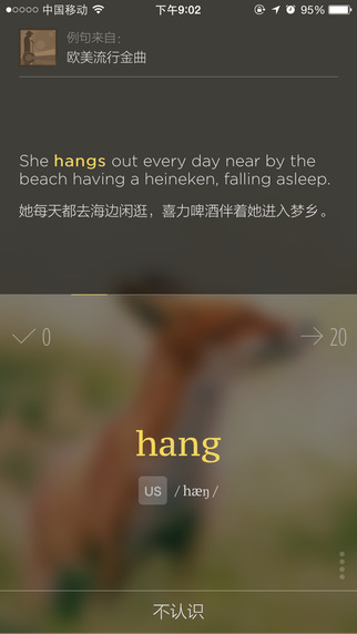 而不背单词最有特色的一点,即其每个单词都配有多个的例句,这些例句大多来自有声读物、美剧、名人演讲、欧美金曲等趣味性比较强的内容,可以让用户除了记住词的拼写以外,还能把单词置于句子中去理解它在不同场景下的具体意思和用法,学习在每个真实的应用场景这个词是怎么被说出来的。当然,一般情况下要不要看例句是用户自选的,但是如果用户没有做对单词词义的选择题的话,就要听完有声例句才可以去往下一个单词的学习了。
