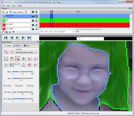 Senasarea视频编辑器可以通过模糊选择视频中的某个对象,例如人物或物体,对其进行特效添加等二次处理。可将编辑处理后的视频保存输出为AVI格式、图像或SWF格式。【使用说明】