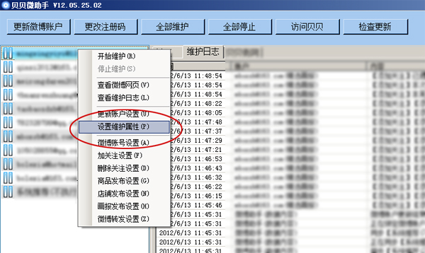 第五步:设置完成后,点击选中帐号,再右键点击帐号名会弹出功能菜单,选择“开始维护”如下图。