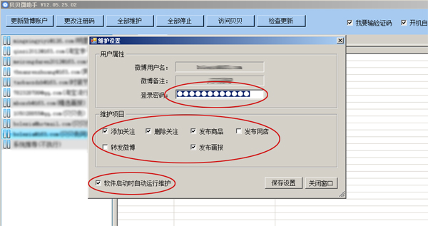 第四步:在打开维护设置窗口中,填写微博登录密码、选择要执行的维护项目、选中软件启动时自动运行维护并保存,如下图。