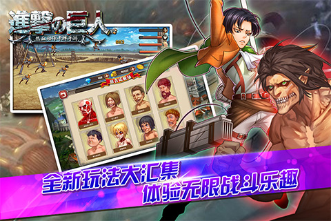 《进击的巨人Ol》手机游戏是一款以热血动漫《进击的巨人》为蓝本的新一代动作类卡牌手机游戏。游戏传承原著动漫场景,延续剧情,独创了以发现和攻击敌人弱点和要害为目标的战斗,打破传统卡牌呆板、无脑流战斗的瓶颈,实现技能实时释放,完美还原立体机动装置推进,设计了追击、遭遇、阻击三种战斗模式。并且将场景破坏交互引入战斗,忠实再现原著中城墙上大战超级巨人、草原上骑马追击、下水道和建筑物内部被巨人破坏等经典战斗场景。采用漫画布局的游戏副本,设定为韩吉试验场的科技系统,以及开启城门进行壁外远征。壁之教的神秘宝藏,罗斯托特区的危险矿山等系统和玩法,与原著设定完美结合,使玩家倍感亲切,提升了玩家的带入感。