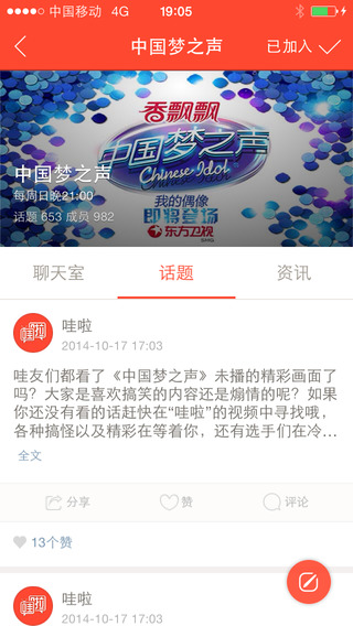 节目实时互动:电视直播聊天室,边看边吐槽,精彩评论同步上屏粉丝活动:给你24小时不间断的话题讨论,更有众多明星粉丝见面会活动等你来参与明星面对面:明星动态即时展现,你也可以在哇啦里给明星留言或向TA提问。