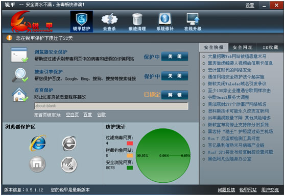 锐甲新版加强网页防护,对用户使用搜索引擎的搜索结果进行审查,并标示钓鱼、恶意及色情等不健康网站,和可信的健康网站。目前可支持百度搜索引擎,google搜索引擎,Live Search搜索引擎