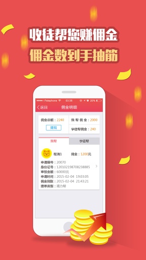无论你是否为专业的金融从业者,只要您有贷款客户的简单信息,轻松提交,等着收佣就行。收了徒弟,躺着就可以赚钱了。如果您是社交达人,那么您已经走在土豪的路上了。