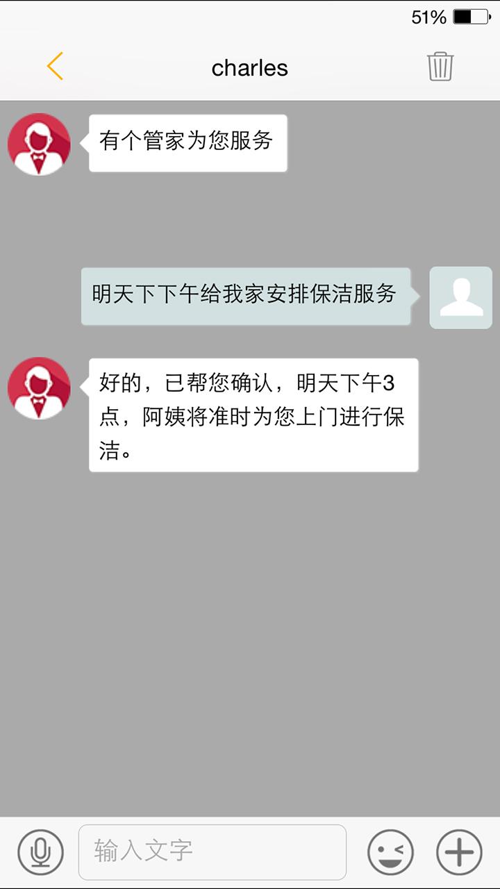 贴心管家:生活琐事,随时随地手机吩咐管家,一键享受管家式服务。省事省力:省去挑阿姨比服务看评价的各种繁杂,管家替您挑选高品质服务人员,快速准时提供高品质服务。专业品质:各类生活服务从选人、签约到服务均采用标准化流程管理,全部依据业内最高标准。安全可靠:服务人员全部经过严格培训及层层筛选,且与保险公司签订专业保险协议,拒绝任何有不良记录的服务人员,全面保障您的权益。服务有以下项目: 1.家庭保洁/小时工;2.长期钟点工(保洁、洗衣、做饭);3.新居开荒;4.家居保养(地板打蜡、沙发保养、厨卫保养、纱窗更换);5.家电清洗(抽油烟机、空调、微波炉、电烤箱清洗);6.管道疏通