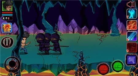 - 解锁新的场景关卡进入战斗画面!- 游戏战斗画面,点击左下方的按钮控制角色移动,点击界面右下方的按钮控制角色拳击脚踢操作!