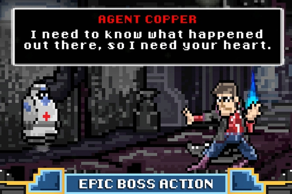 和仿Gameboy风格《寻鸽者》或者《2-bit牛仔》不一样,《机器人逃亡》是一个风格更近似于红白机或街机的横版射击过关游戏(开始游戏需要投币哟)。总体来说,《机器人逃亡》的剧情比较慢热,玩起来尚算过瘾,当然,最大的亮点,就是那群神经兮兮的开发者了。