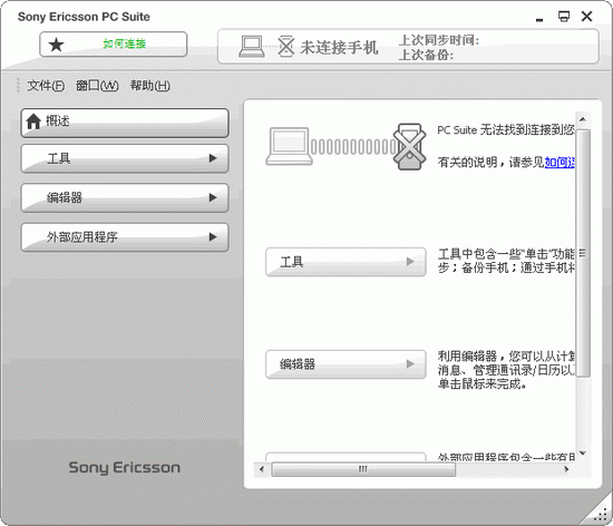 Sony Ericsson PC Suite是一套免费软件,用来增强Sony Ericsson 移动电话的功能,包括下列软件程序:文件管理器,图像编辑器,Sony Ericsson MMS Home Studio,移动网络向导,同步站..