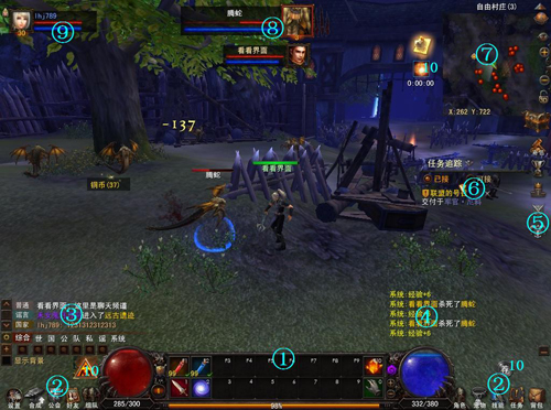 ① 主信息栏a) 角色等级、生命值、魔法值、经验值的显示