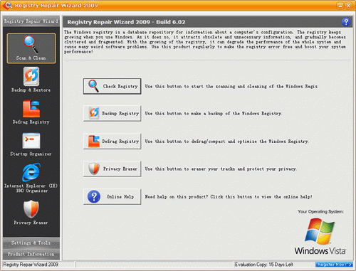 Registry Repair Wizard 能扫描注册表,找到错误的和垃圾信息。通过修复这些错误信息,系统会运行得更快。备份/恢复功能可以备份整个系统当前状态的注册表,当遇到系统错误时可立即恢复。