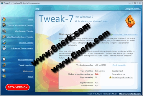 Tweak-7 V1.0 Build 1115 英文官方安装版 是TotalIdea推出了Windows Vista调整优化软件,它可以调整Vista中上百个隐藏选项,优化和个性化你的机器.而Tweak-7则是TotalIdea针对Windows 7推出新调整优化软件!