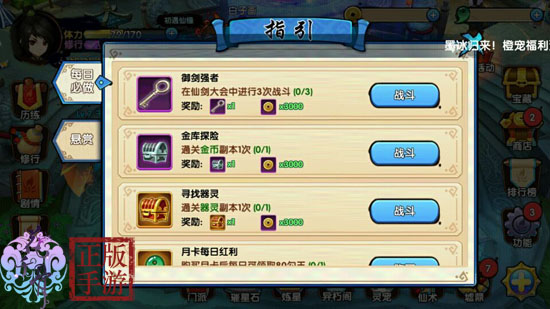 日常任务和悬赏任务只需要点击左侧的(指引)按键就可以打开任务列表。比如这个通关副本的任务,点击战斗就可以进入对应关卡的选择界面: