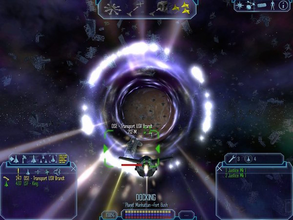 我按住导弹发射按钮,准备拉这两艘“误导”我们的Rheinland战机一同陪葬。他们似乎更明白形势,开启隐形护罩消失了!当敌战列舰放出一支攻击编队后,那两架Rheinland战机突然出现在战列舰旁边,发射出多颗鱼雷弹,竟然将战列舰摧毁了!看来,Rheinland的内部并不是铁板一块。接下来与敌攻击编队的战斗非常艰难,由于维修品已在前面的战斗中几乎消耗光了,而且一直没有得到补充,我不得不将大部分精力放在躲避敌人的攻击上。清除这帮敌人,我们才得以经由传送洞回到Bretonia星系,安全降落到Leeds星球上。回家的感觉真好!经过这么多回Rheinland战机的“训练”,我再去找星系里Molly势力的晦气时竟然觉得比以前轻松许多。当升至11级后,朱妮约我到Dublin星系会面。