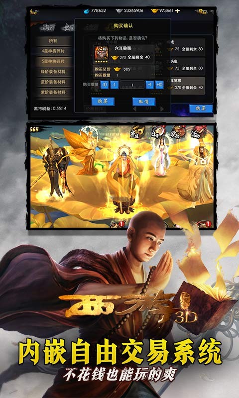 厌倦了传统卡牌手游“一切靠抽”的坑钱设定吗?《西游降魔篇》首创全自由交易模式,无论是极品卡牌还是强力装备,所有一切道具全部开放交易!不花钱也能玩得爽!