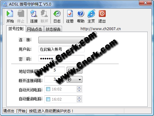 宽带定时自动重拨器 V2008 简体中文绿色免费版 支持modem、ISDN、ADSL等标准拨号网络的通用拨号器,能自动拨号上网,断线自动重拨,自动清除Cookies,可以周期性自动断线再上线,更换不同的IP,以方便限制IP的操作,例如群发广告软件,邮件群发,点击网页(支持POST/GET)等,此款软件是目前效率最高,占用系统资源最低的拨号器!