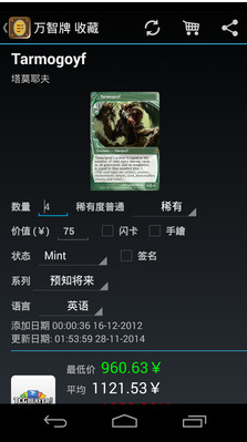 万智牌收藏可以让你节省万智牌卡你快速直接地显示在你的设备上。魔法风云会愿望单让您能够迅速方便的保存您想要的卡牌,并显示图片、各个知名网站的现时价格(使用您所在位置的货币)、可取得的延伸系列、卡片名称等让您能更方便的收集和交易卡牌的信息