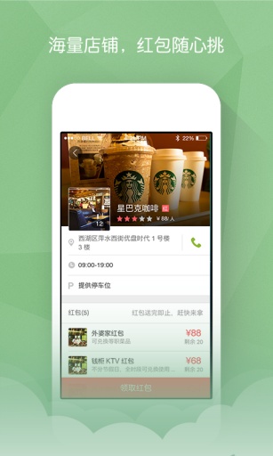 云淘红包是基于大数据平台的新型消费平台、是新的结算、优惠券平台。吃喝玩乐均在其中,登陆即可免费领取体验式红包。在云淘,你可以拿到星巴克咖啡体验券,也可以消费换取等额健身体验卡券,还可以得到洗车养护红包,只有你想不到,没有你在云淘找不到的红包。【软件特点】