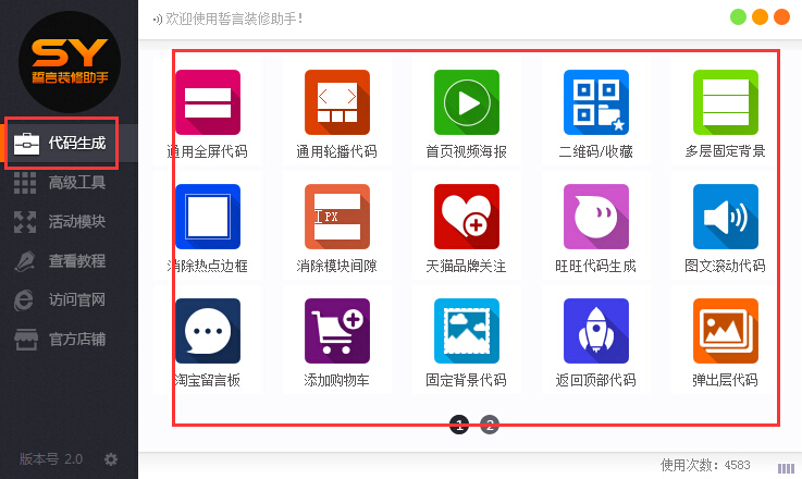 誓言装修助手是一款专为淘宝店主制作的淘宝装修设计辅助软件,这款软件可以帮助用户一键装修淘宝店铺,拥有代码快速生成功能,支持快速生成通用全屏代码、通用轮播代码、首页视频海报、多层固定背景、淘宝留言板、固定背景代码、返回顶部代码等常用淘宝店铺装修代码,并集成了修复图片地址、切片批量加链接、代码预览器、一键下载主图等高级工具,还提供了双11、双12的活动模块,为淘宝店家店铺装修提供便利。